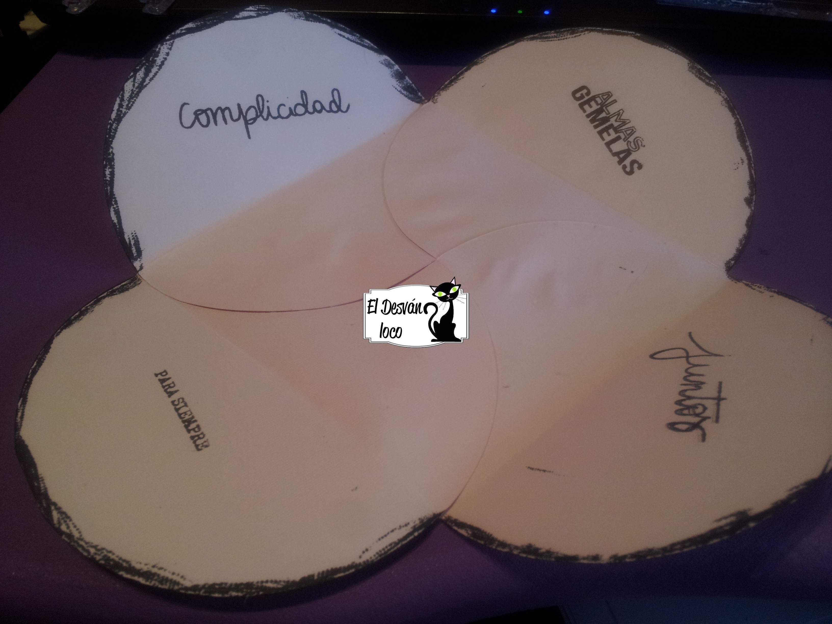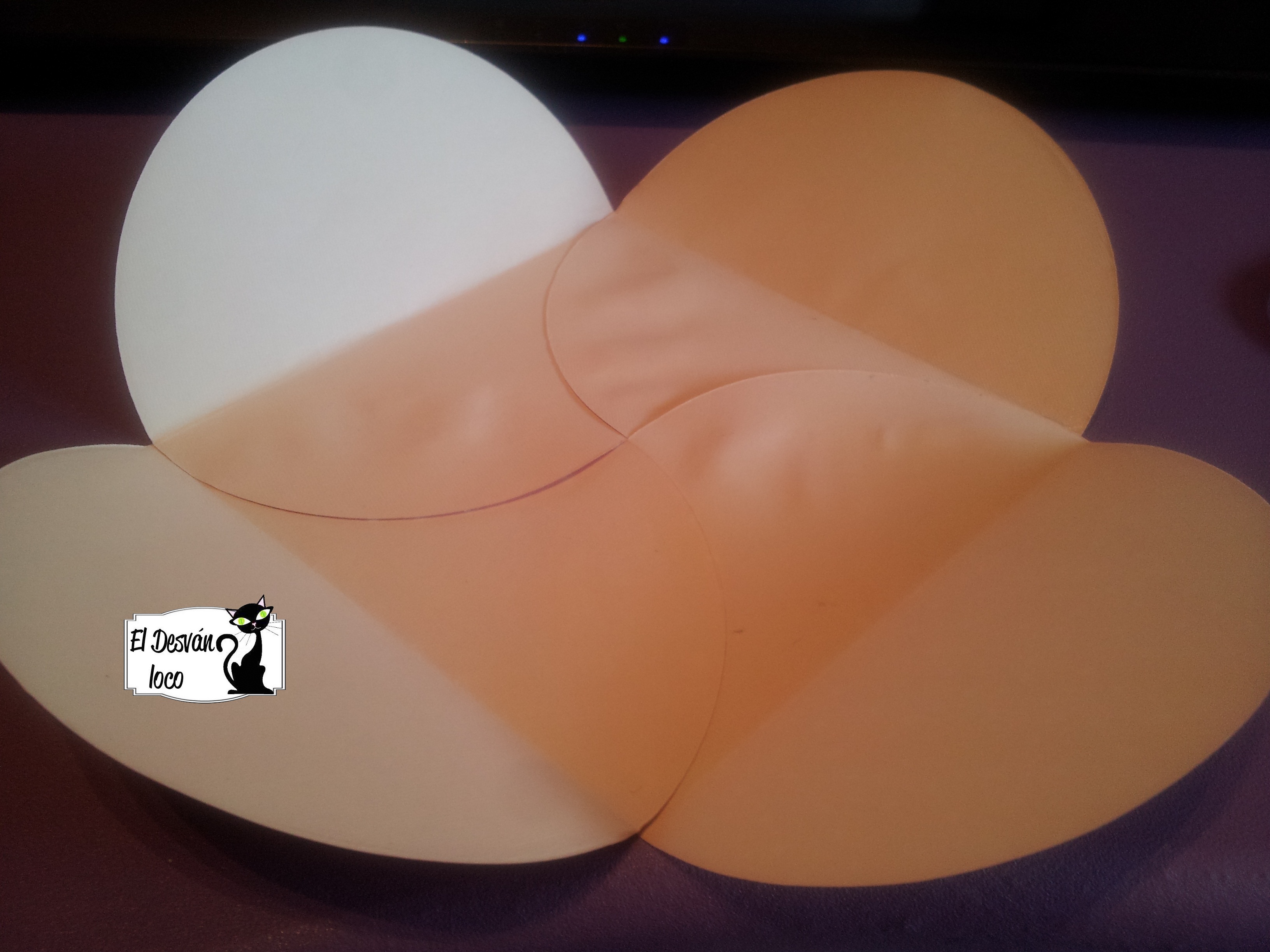 - Colocamos el segundo circulo, encima de la mitad del primer circulo y así sucesivamente con los cuatro círculos. Siempre dejamos una mitad de cada circulo por encima. Dar Pegamento en la parte del circulo que queda debajo del siguiente (Seguir las fotos).