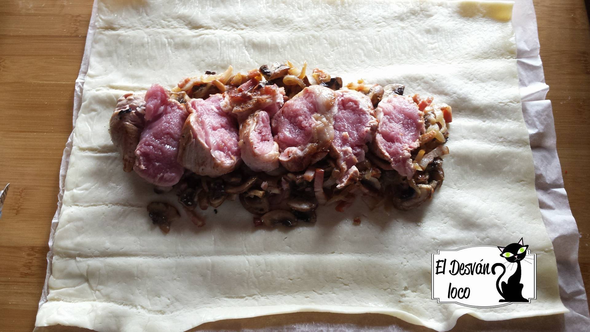 Cuando ya se ha consumido la mayoría del liquido del salteado de champiñones y bacon lo reservamos en un plato durante unos minutos para que termine de absorber si queda algo de salsa y bajamos el horno a 180º. Cuando han pasado unos minutillos, ponemos el hojaldre encima del papel del horno y ponemos el salteado encima de él (si no queréis tropezones podéis hacer una crema con todo el salteado incluido el bacon con la batidora), luego ponéis el solomillo de cerdo encima y lo cerráis (para que se os pegue el hojaldre con el dedo mojado de agua le dais en el borde y luego lo cerráis y se queda pegado). Yo suelo cubrir el solomillo primero con lo de arriba y abajo y luego los bordes, hago como en las empanadas, como un rulito.- Pintamos el hojaldre con el huevo batido y lo metemos en el horno. El tiempo que va a estar dentro del horno unos 20 min mas o menos y también depende de como os guste de doradito el hojaldre, a mi me gusta mas bien blanquito así podéis dejarlo mas tiempo si con 20 min os parece poco. Y voila!!! ya tenéis un solomillo super rico para comer de mil maneras, porque yo me lo como hasta del tiempo, ni lo caliento muchas veces. Podéis hacerle una salsa para acompañar si queréis de pimientos del piquillo, o simplemente comeroslo así que esta buenísimo.