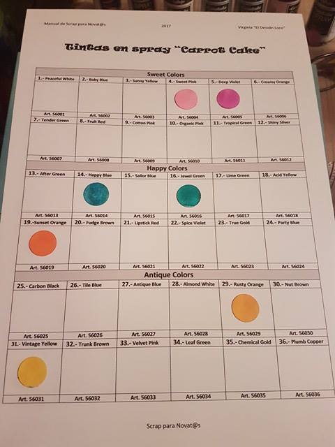 Mi intención es ir haciendo este tipo de inventario con todas las tintas y materiales que tengo y luego meterlos todos en un archivador y así tenerlo en la scraproom para que siempre que lo necesite poder consultarlo. Lo mismo me animo y me hago también uno tamaño mas pequeño para llevarlo en el bolso ajaja pero eso ya seria cuando el grande este hecho que es el que mas me interesa. Tanto en el grupo de facebook «Escuela de Scrap para Novat@s» como en esta entrada, os he subido un pdf que es la plantilla que hice para hacerme este inventario de estas tintas, por si alguien tiene alguna de ellas y os apetece haceroslo. plantilla-tintas-spray-carrot-cake-m-s-p-n